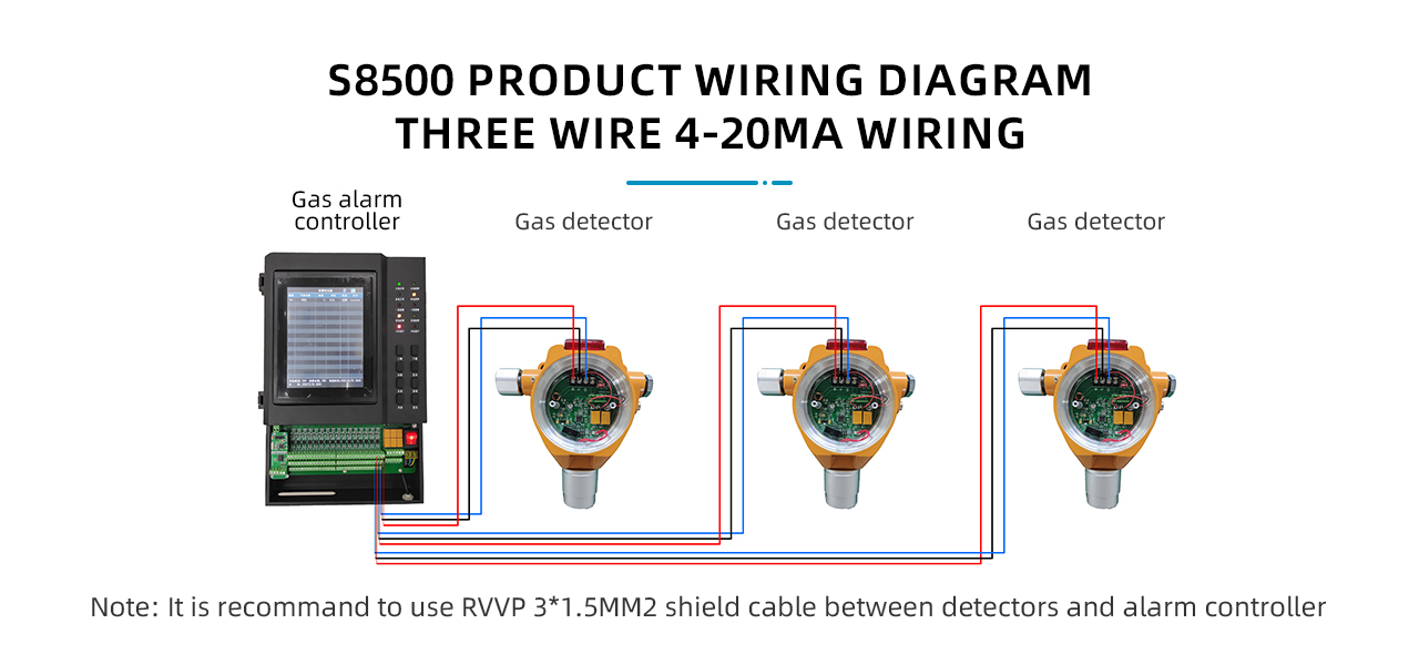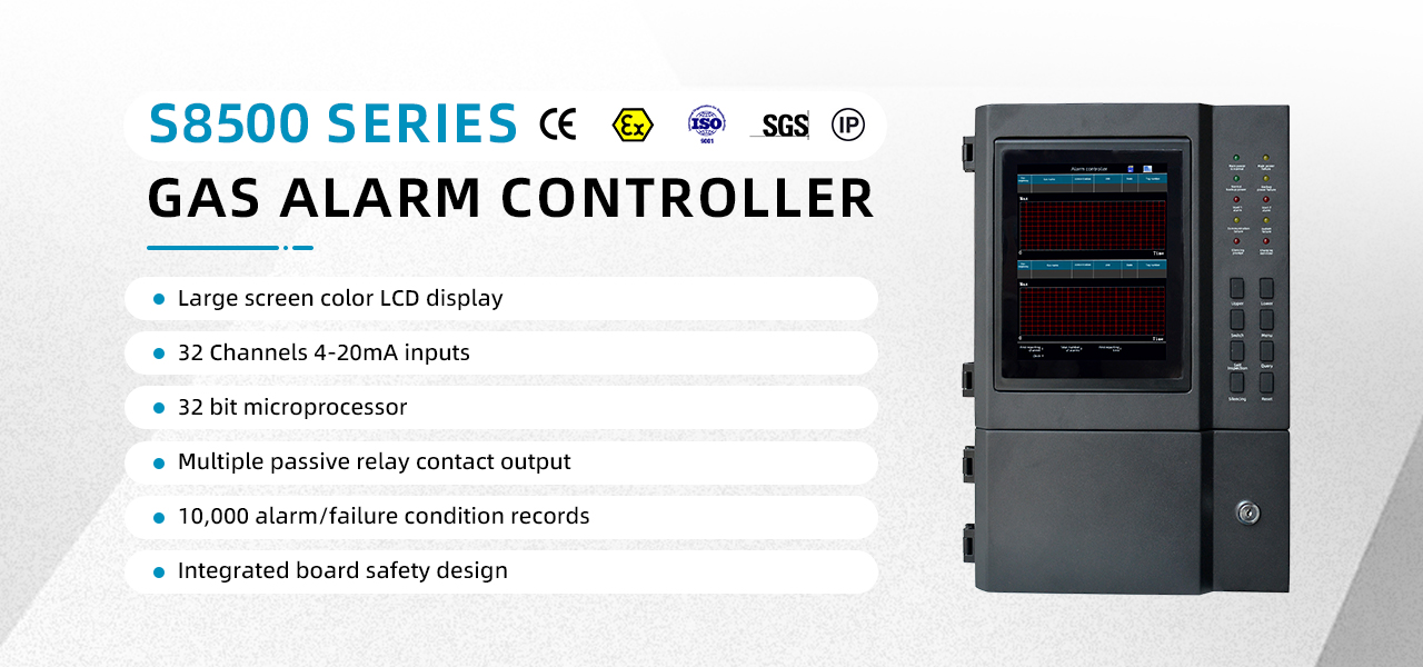 The S8500 gas alarm controller is a multi-point monitoring gas alarm developed by our company to detect the concentration of the gas to be tested in the ambient air. When the concentration of the gas to be tested reaches or exceeds the preset alarm value, the control is controlled. The device immediately issued an audible and visual alarm to remind us to take safety measures in time and start the actuator to control the driving of exhaust air or other peripheral equipment to prevent poisoning accidents, explosions, and fires, thus ensuring the safety of life and property.